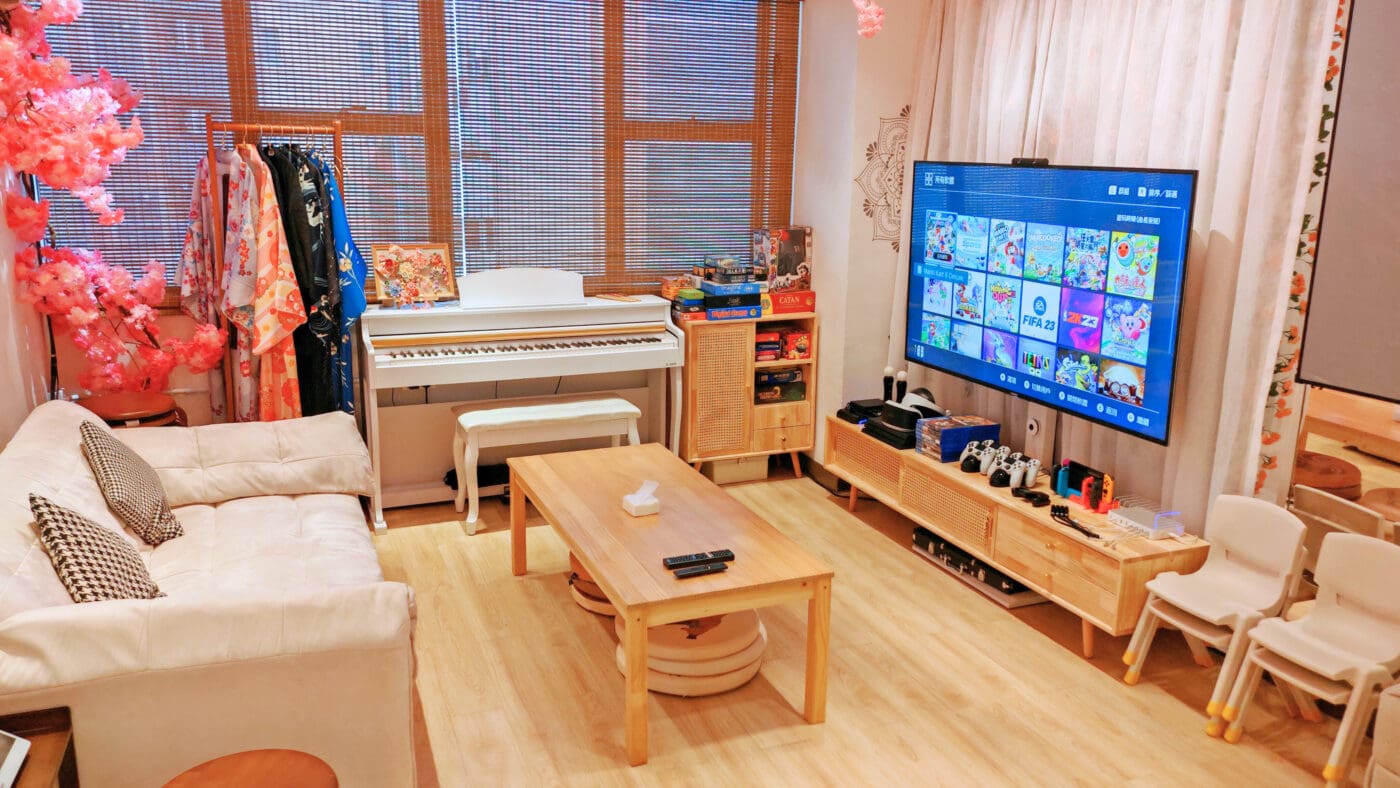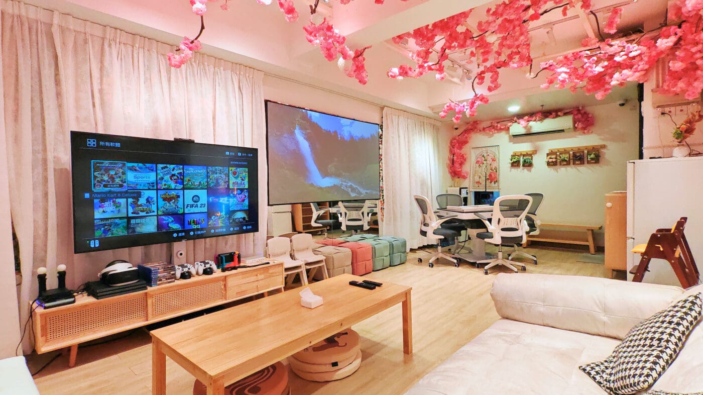 我們還提供90吋高清投影、65吋4K智能電視、4支無線麥克風和Bose音響系統。遊戲方面,設有Switch、PS4和VR,有多款遊戲可供選擇。此外,還有電動麻雀機(過山車款)和超過35款桌遊,讓你同朋友玩個痛快!
